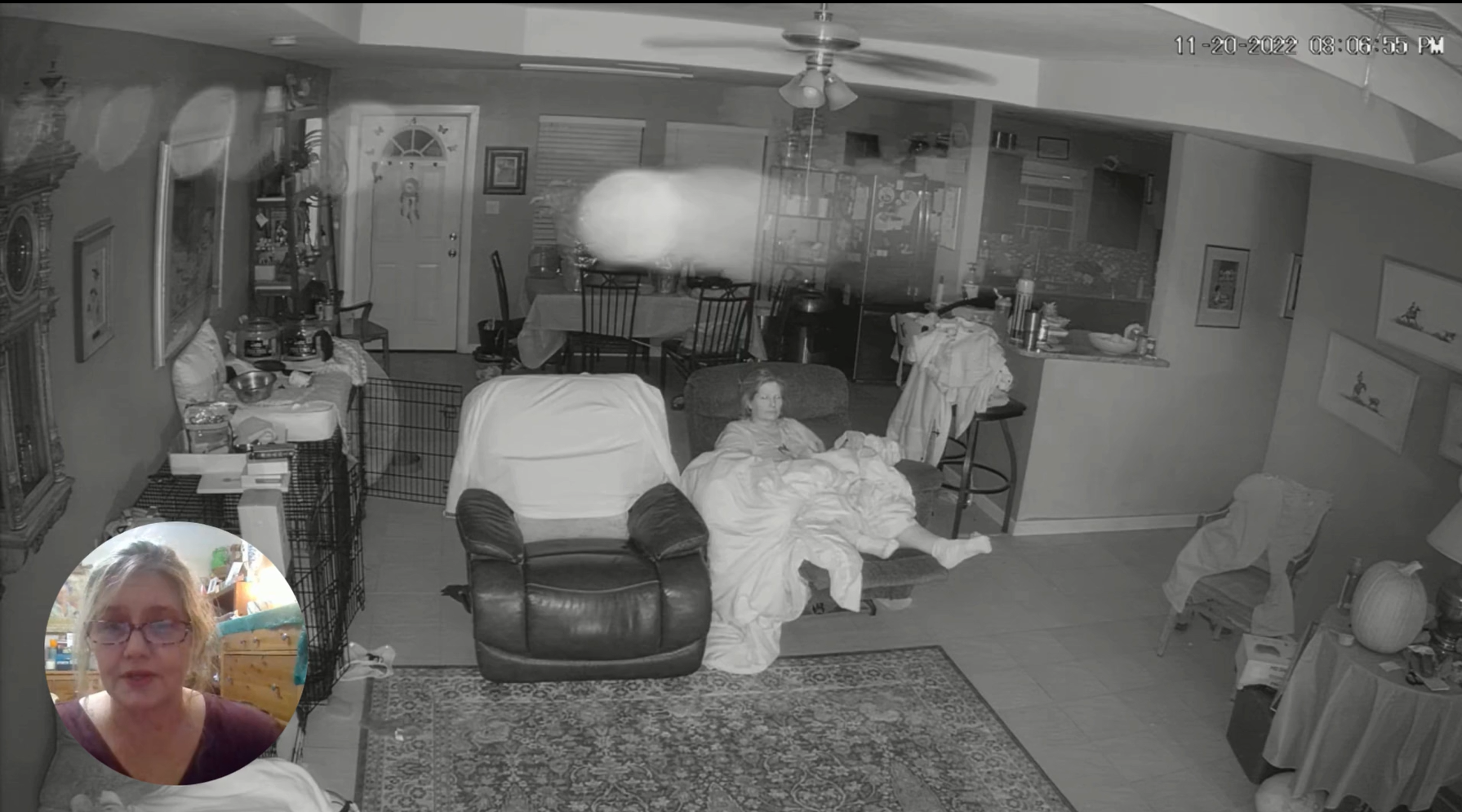 Right after my husband shut off the kitchen light, the living room's infrared camera switched on to revial, what I've termed, an Ethereal orb string. I believe this is how these plasma blobs procreate. Instead of a spiderweb structure and an egg sack, these organisms create translucent filiment strings where they "lay" their orb eggs. A few undetermined hours later, these orb eggs "hatch" by fighting against the filiment to free themselves.